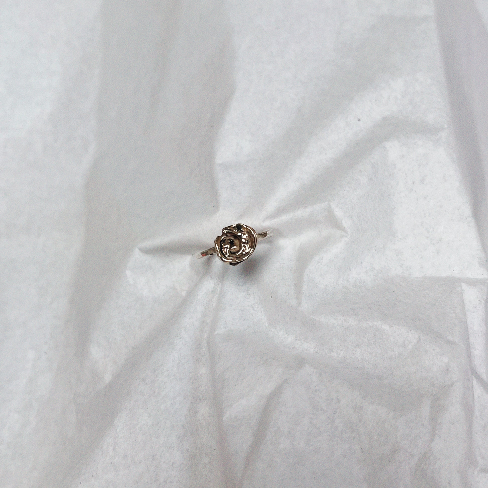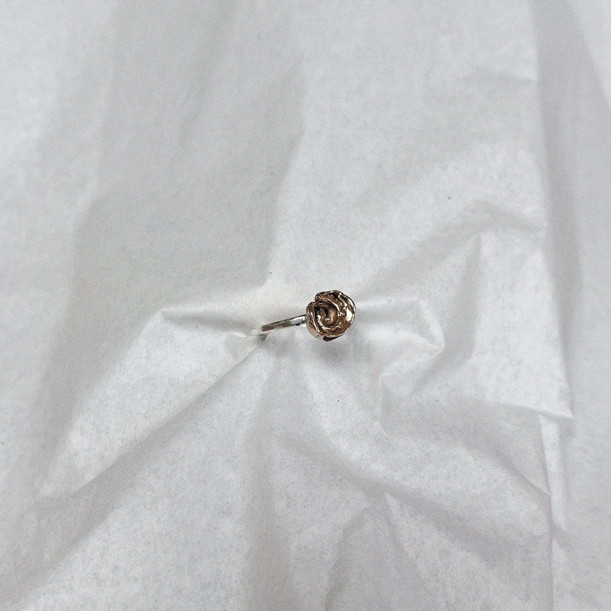 A playful mixed metal ring using the lost wax casting method in recycled sterling silver band and brass (the charm).