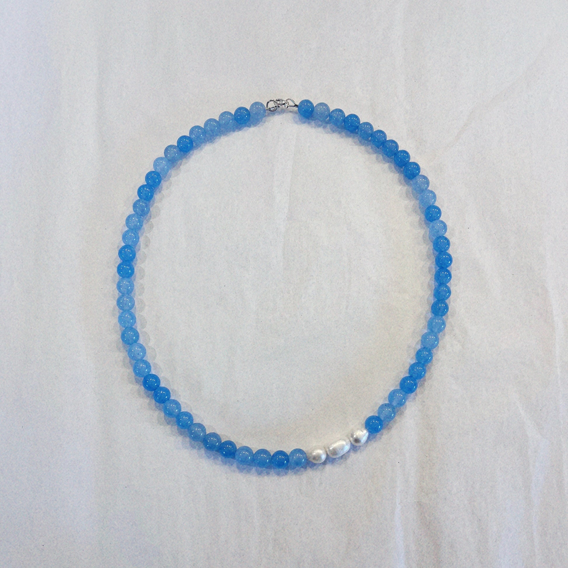 This lovely piece sits around 45 cm long and is made out of freshwater pearls, glass beads, 14 strand steel string recycled sterling silver fastenings for a hypoallergenic finish.